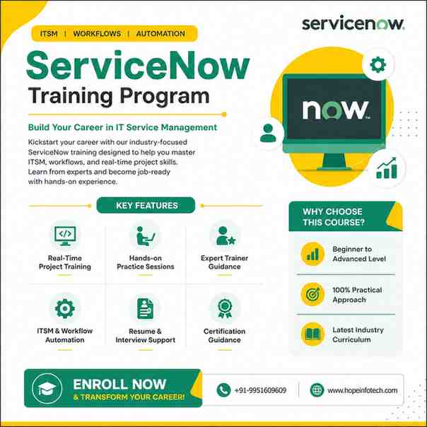 Boost your career with ServiceNow Training Course in Hyderabad designed for beginners and professionals. Join the Best ServiceNow Institute in Hyderabad to gain hands-on experience with real-time projects. Our Advanced ServiceNow Training in Hyderabad and ServiceNow Online Training offer flexible learning. Enroll in our ServiceNow Developer Online Course to master development skills, workflows, and integrations for high-demand IT roles.